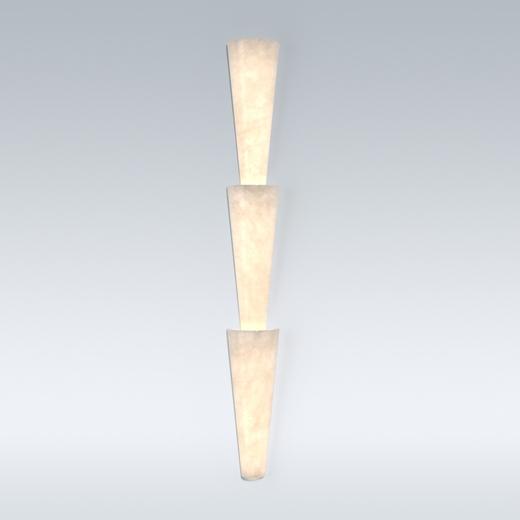 Les appliques Cascade Solo et Trio ont une forme rectiligne et offrent une lumière diffuse et élégante grâce à l'albâtre et son orientation vers le haut.