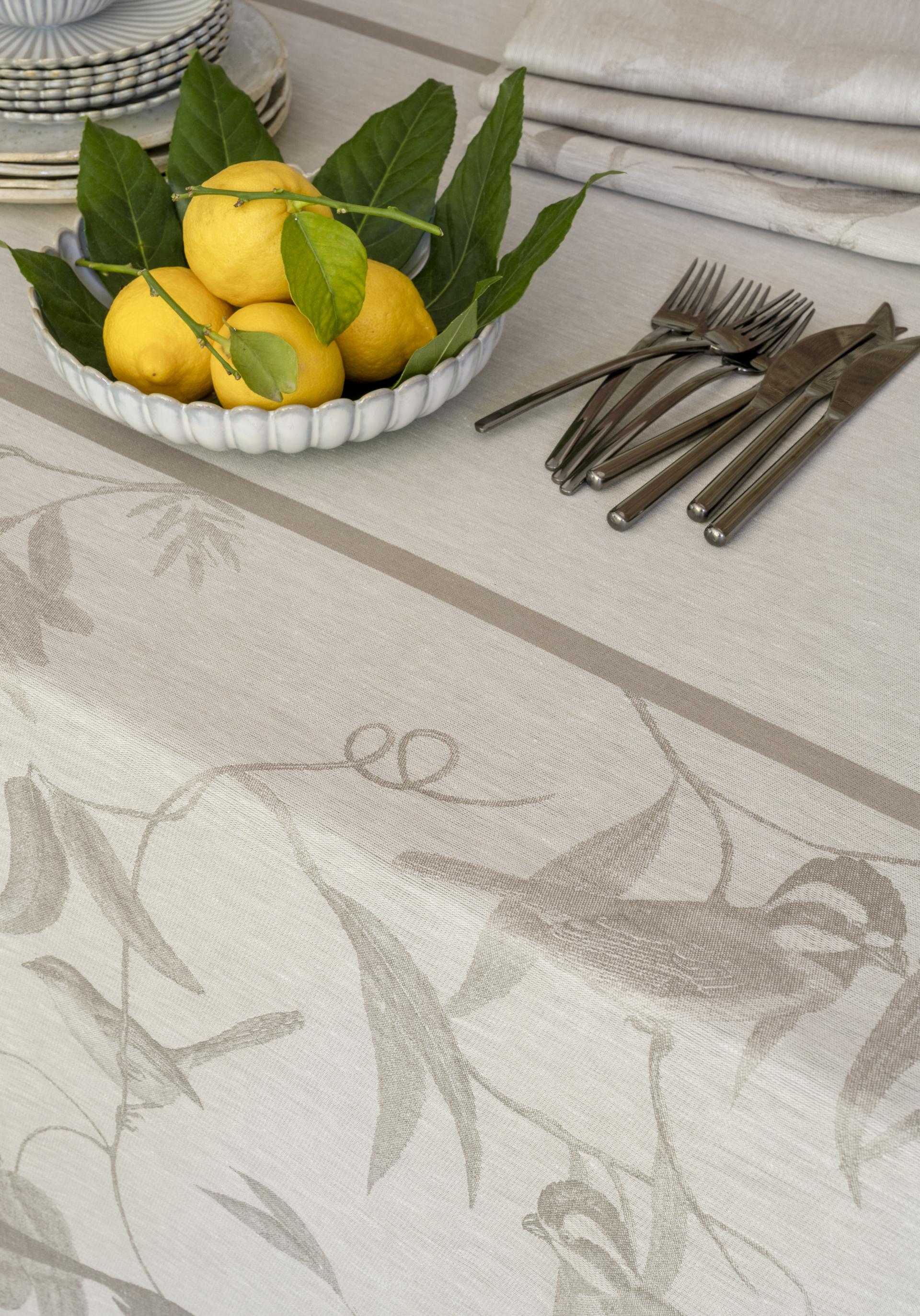 Interior decoration meets the art of the table with the Volière collection. Quinsaï's meticulous designs blend with Le Jacquard Français' know-how in a delicate and fine weave. From this collaboration comes a sophisticated collection in 100% linen.